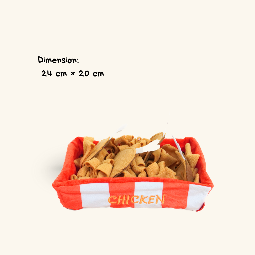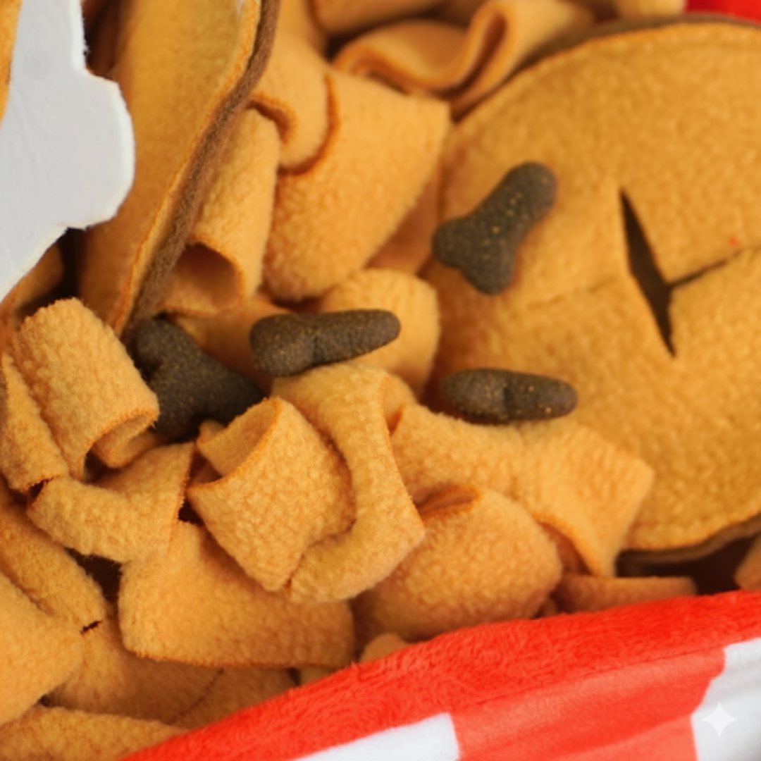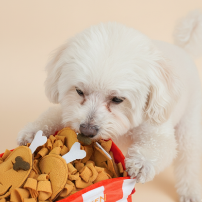 Turn treat time into a feast with the Snack Plate Sniffing Toy! Designed to look like a bucket of fried chicken, this playful enrichment toy is packed with layers of fabric folds and chicken drumstick plushies for your pup to dig, sniff, and explore. Hide kibble or small snacks inside the folds, and let your dog’s natural foraging instincts take over.